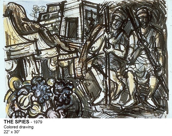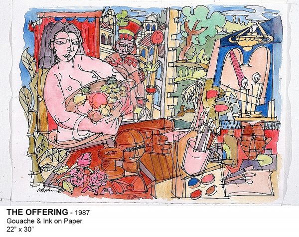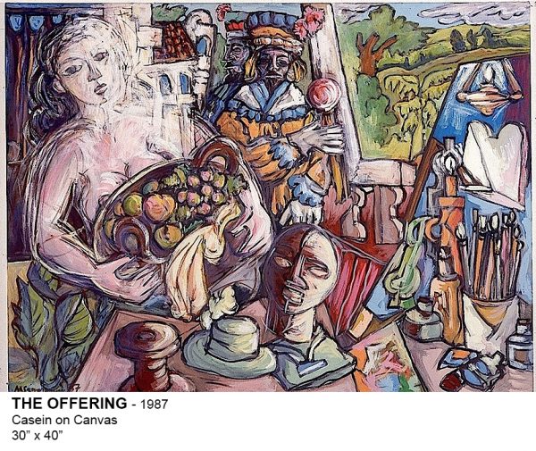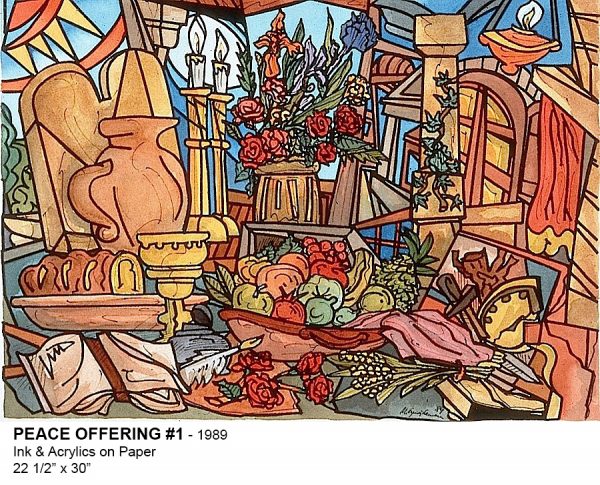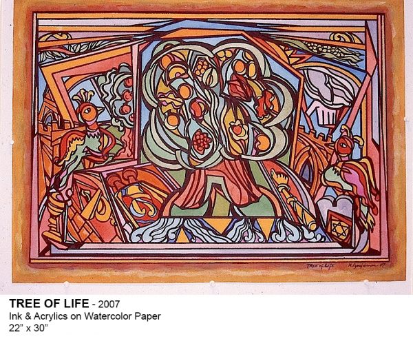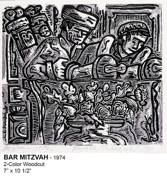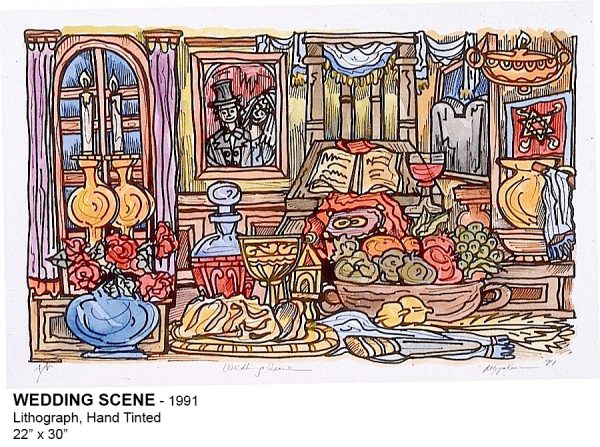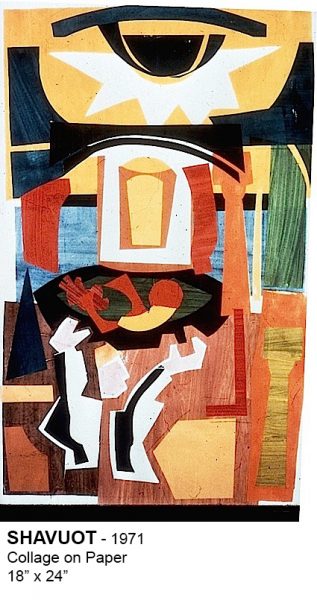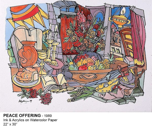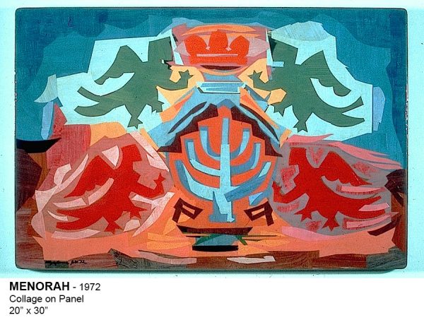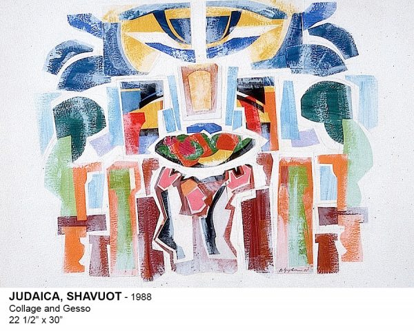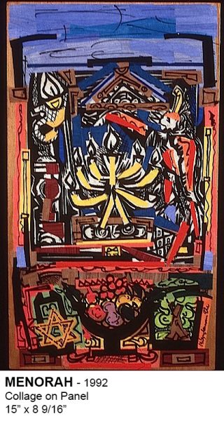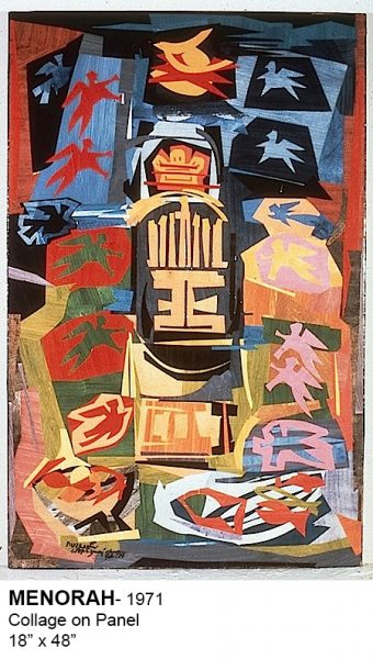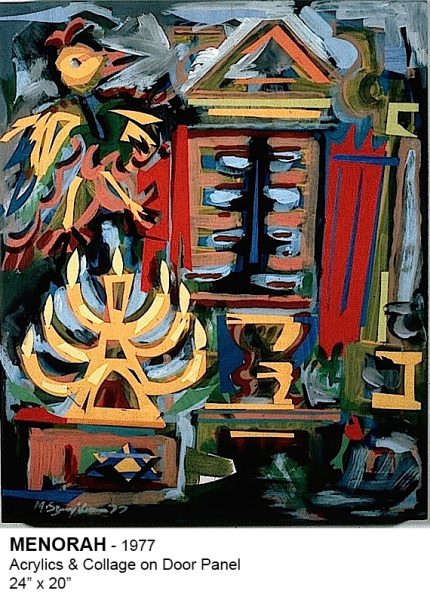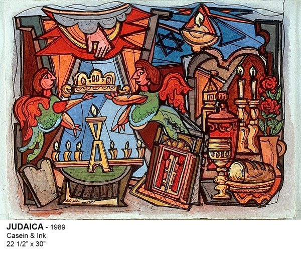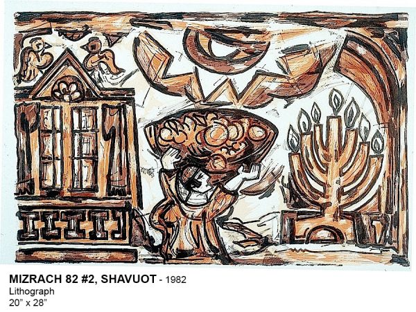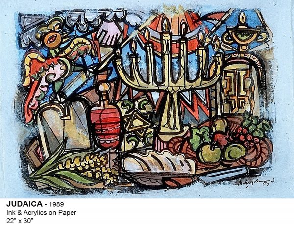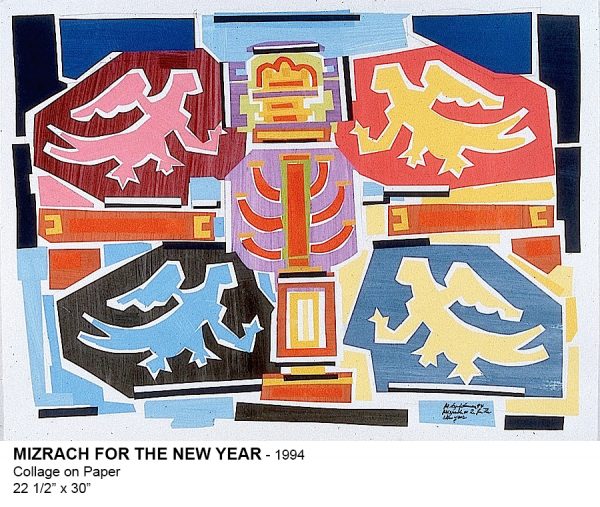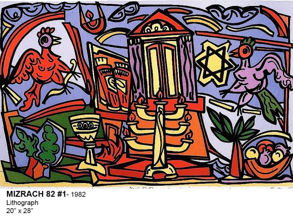 Sznajderman’s imagery includes Jewish symbols, holiday celebrations and other themes. Many of these works are titled “mizrach.” A mizrach is a decorative image or a biblical quotation hung in a home on the eastern wall, in the direction of the Holy City of Jerusalem.