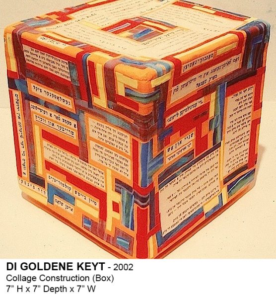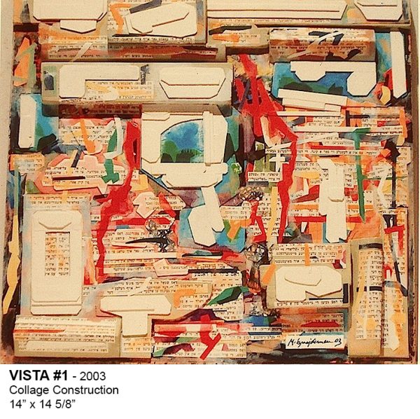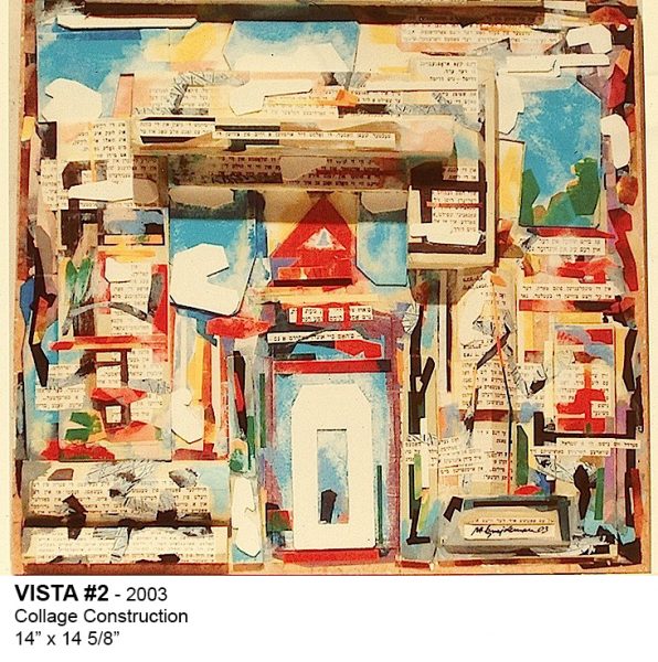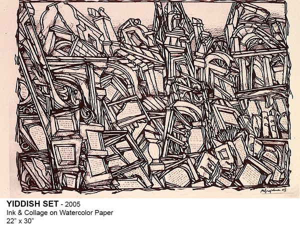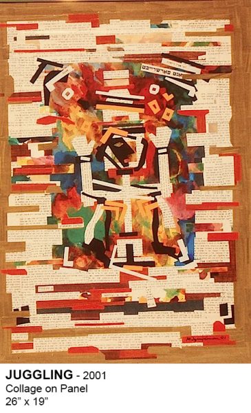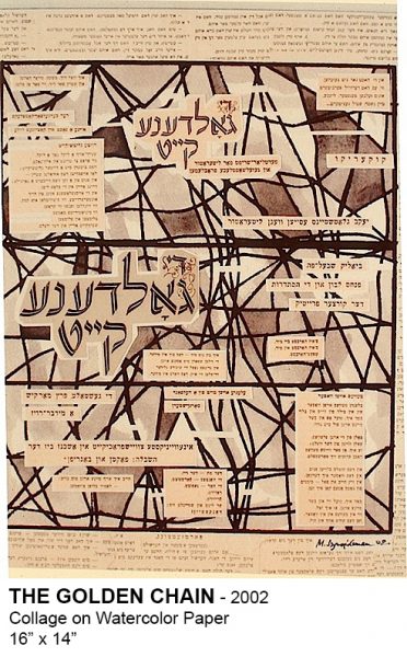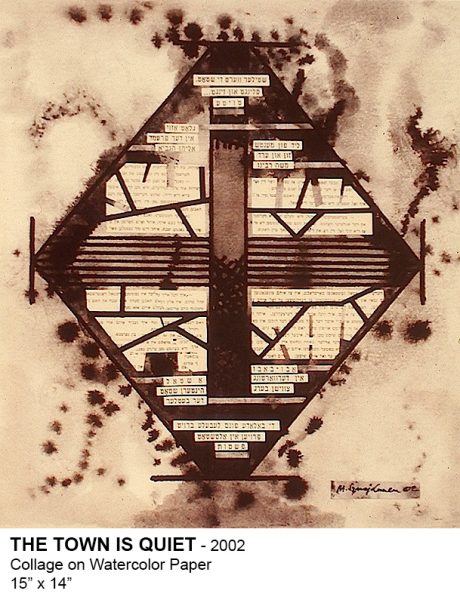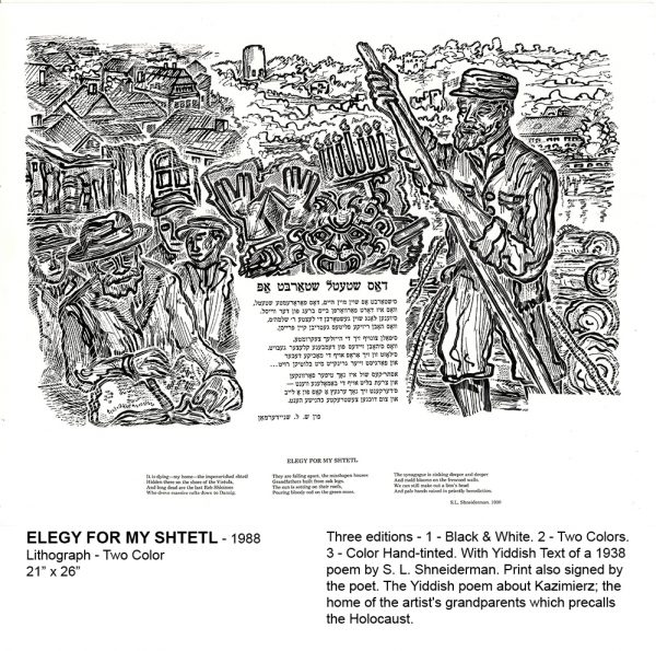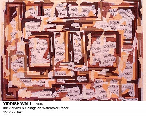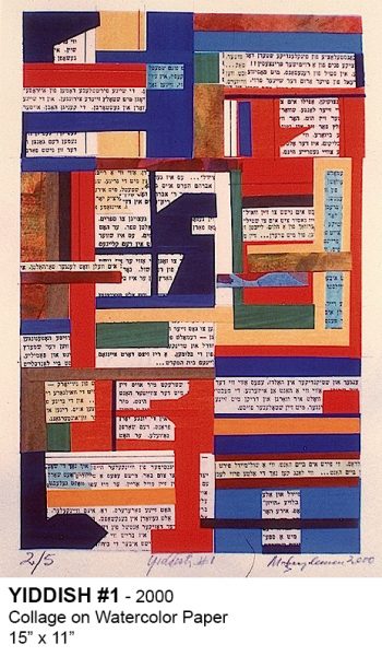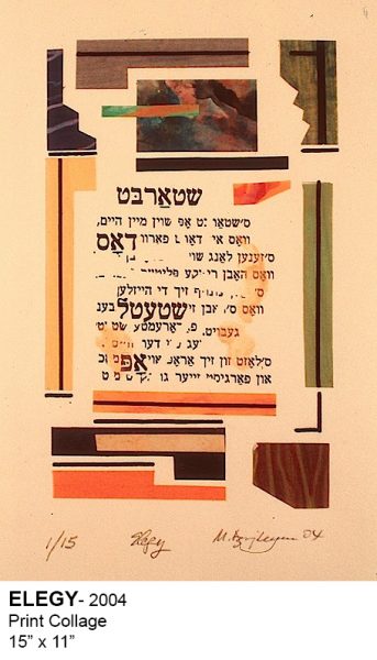 In 1988, Sznajderman printed a lithograph “Elegy for My Shtetl” that included a Yiddish poem written by Sznajderman’s uncle, the well-known Yiddish journalist S. L. Shneiderman. This poem is about Kazimierz, a small Polish town and the home of the artist’s grandparents. It is a premonition of the Holocaust. Later, Sznajderman did a series of collages and collage constructions using Yiddish texts as a background in homage of a culture that Nazi Germany tried to obliterate. Some of these collages were exhibited in a one-person show in 2005-2006 at the Yiddish Book Center, Amherst, MA.